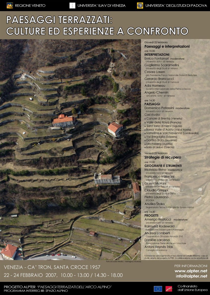 La II Conferenza Internazionale del progetto ALPTER, intitolata ‘Paesaggi terrazzati: culture ed esperienze a confronto’, si è svolta a Venezia dal 22 al 24 febbraio 2007. Al convegno, che ha visto una partecipazione numerosa (60 persone ogni giorno), sono intervenuti rappresentanti di diversi enti ed istituti di ricerca in prima linea nello studio e le attività di recupero dei paesaggi terrazzati.